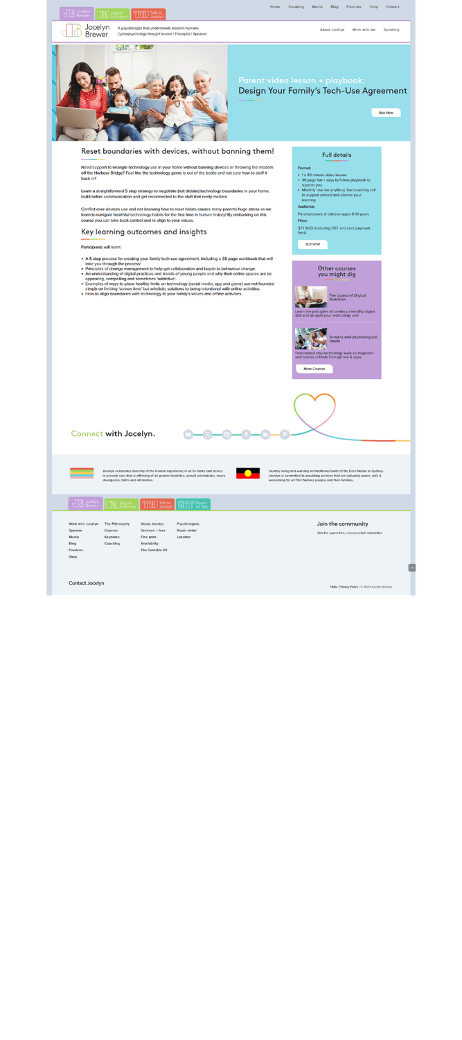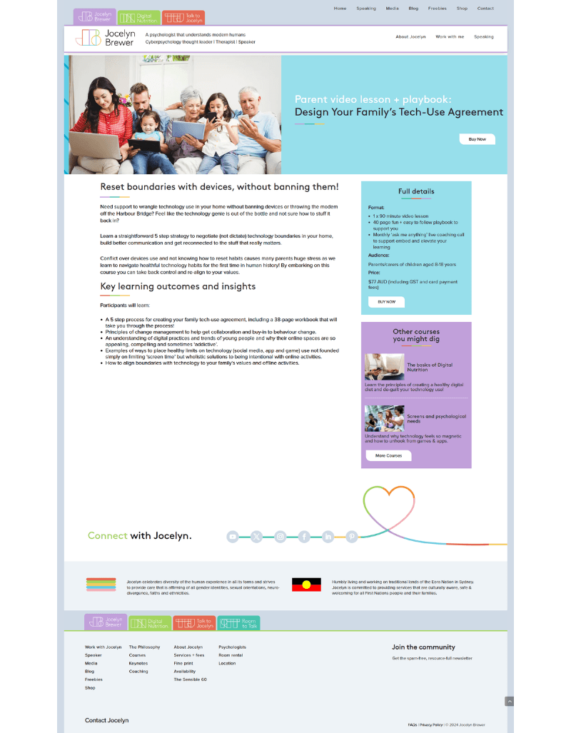 Jocelyn Brewer is a psychologist, educator, and media commentator known for her practical, research-based approach to digital wellbeing. I worked with Jocelyn on her brand repositioning, to clarify her 3 year marketing plan, to streamline her messaging, to create an end-to-end passive sales funnel and bring consistency across her product suite.