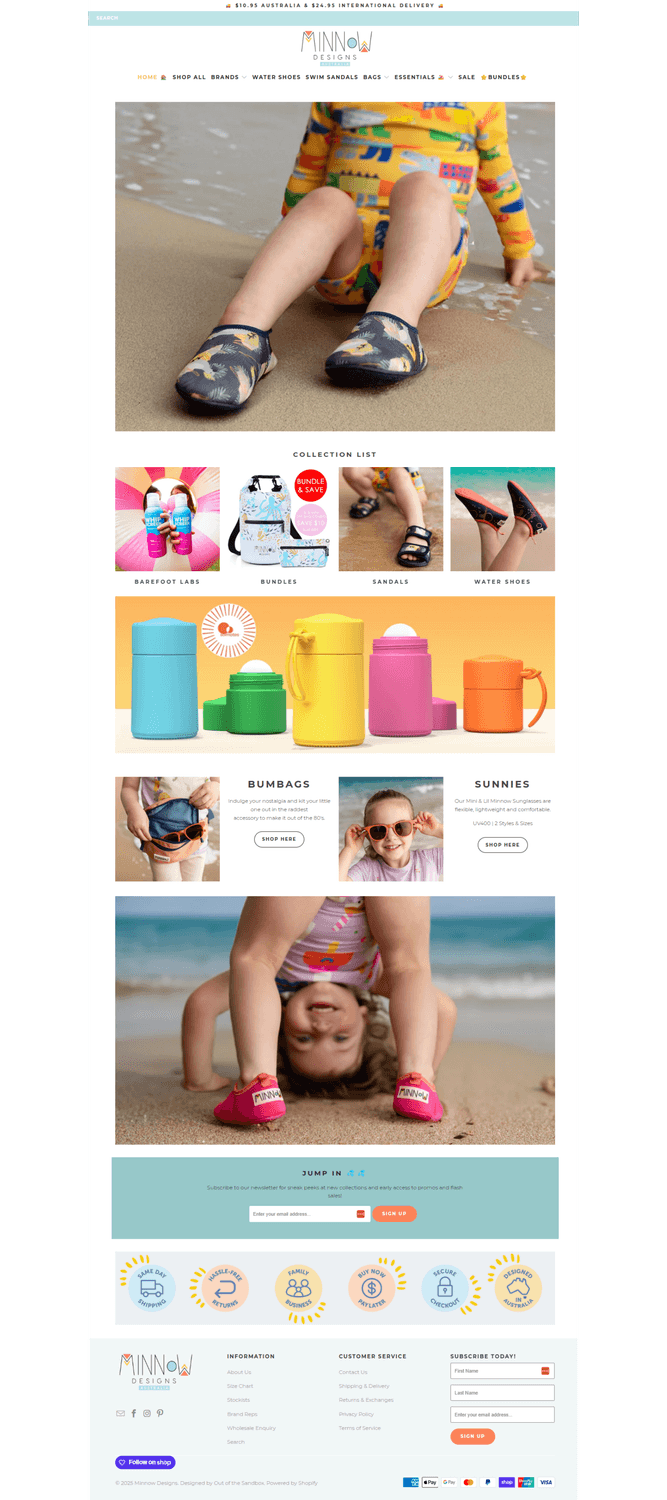 I founded Minnow Designs, a water-friendly footwear and accessories label for little adventurers alongside a friend in 2011, crafting the copy and the brand's distinctive tone and playful positioning from scratch. It became a cult favourite, featured on Shark Tank, and ranged everywhere from Nordstrom in New York to Rebel Sport. The cheeky, conversion-focused messaging delivered 5x ROI and still powers the brand today, under new ownership.