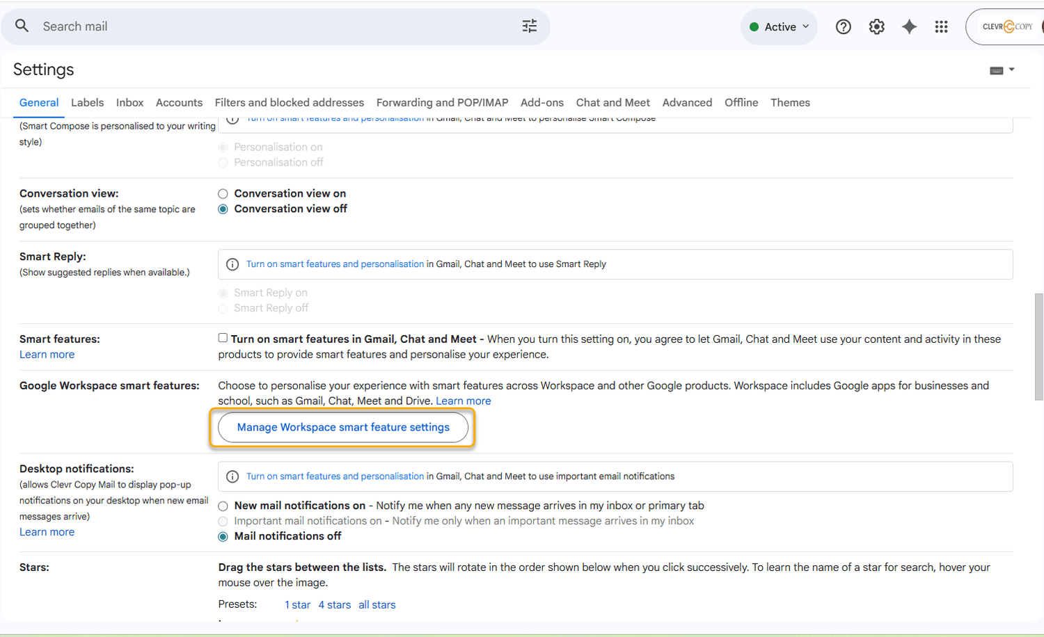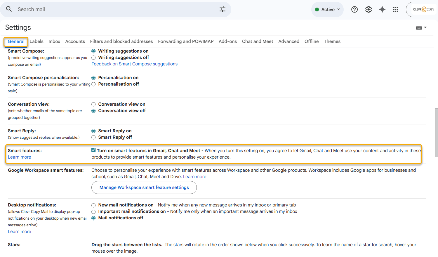 Under the General tab, scroll down to "Smart features" and uncheck the box to turn off smart features.