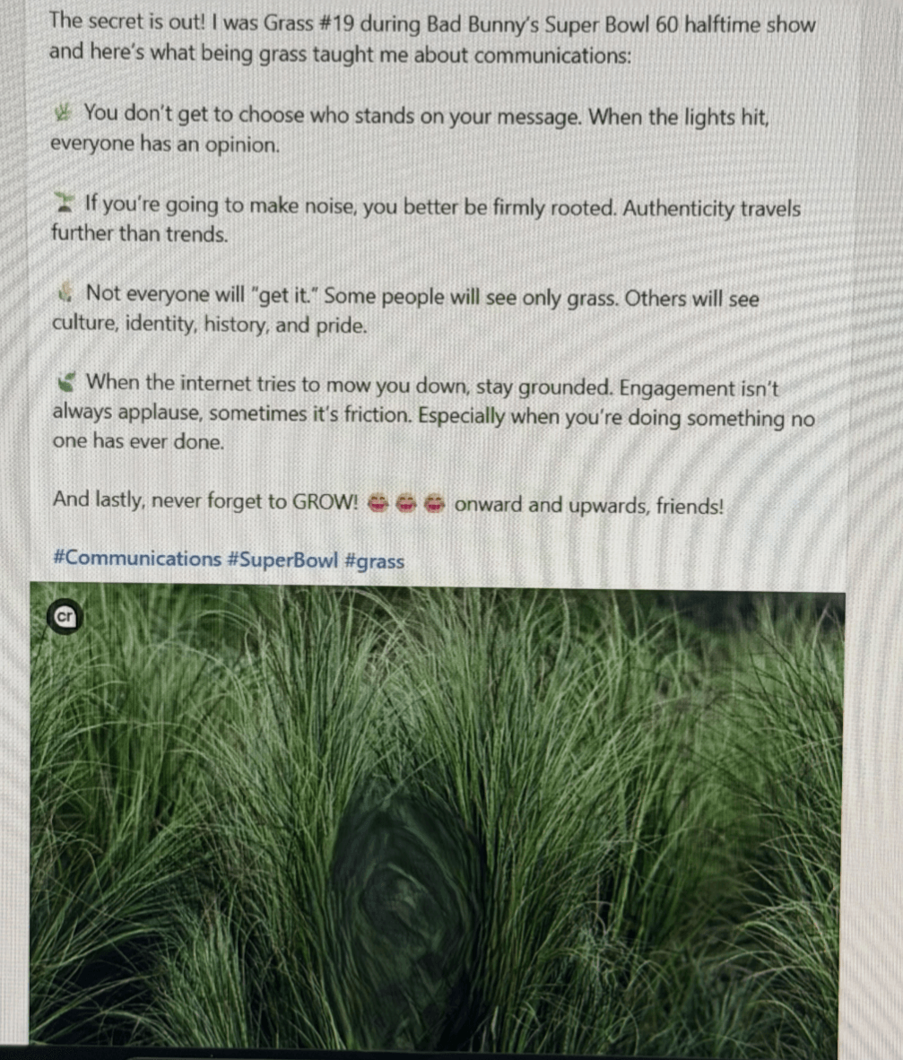 “Woot! I was grass #19 in the Bad Bunny halftime show and I am super proud of myself for doing it even though I was crapping my dacks”